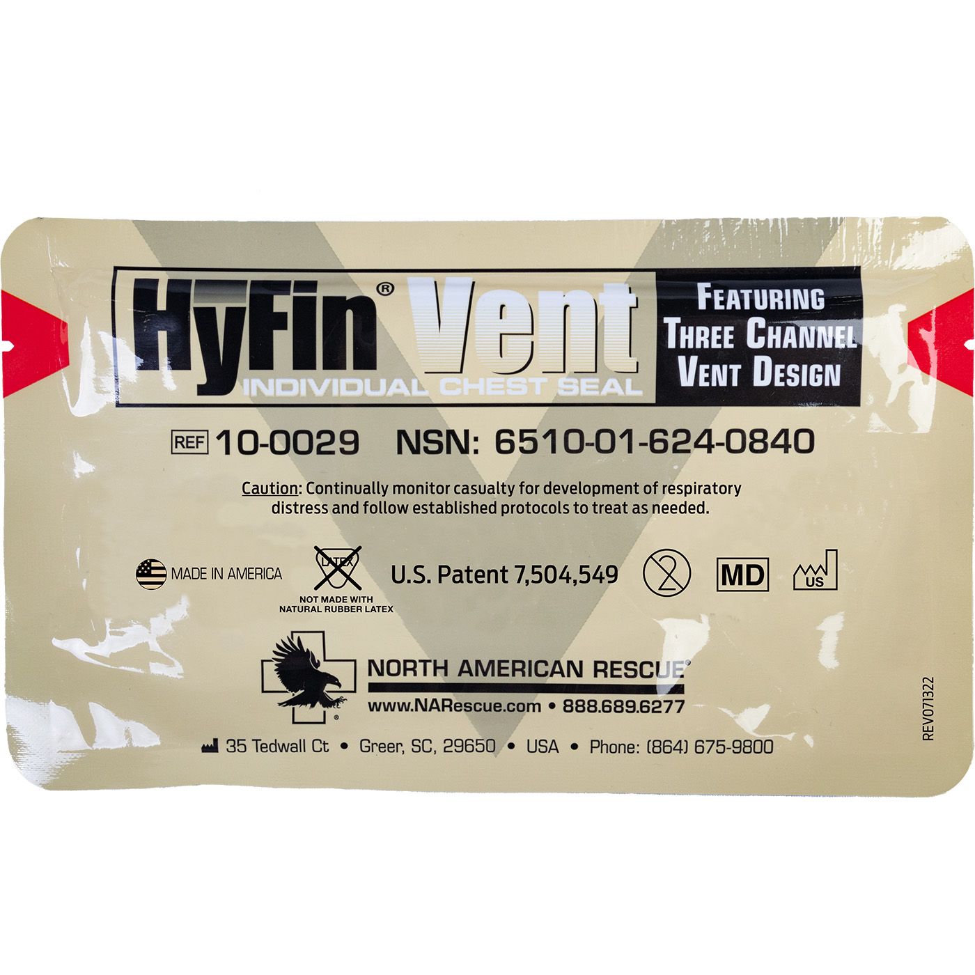 The HyFin® Vent Chest Seal from North American Rescue sets the standard for the prevention, management and treatment of an open and/or tension pneumothorax potentially caused by a penetrating chest trauma. This innovative device provides 3-vented channels that are designed to prevent airflow into the chest cavity during inhalation while allowing air to escape through the vent channels during exhalation. The 3-vent channels are designed to allow blood to escape and also provide a backup fail-safe system, as even if two of the three channels become obstructed, the vent is designed to remain fully operational.